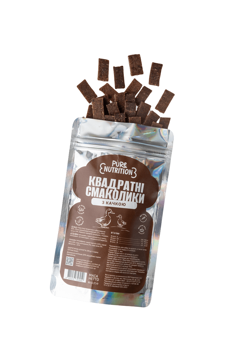Pure Nutrition завжди пропонують приємні ціни та вигідні акції на усю лінійку своєї корисної преміумпродукції. Купити смаколики для собак та котів означає потішити мокроносиків смачним щоденним перекусом. Ви можете замовити квадратні смаколики з качкою в зручній герметичній упаковці на нашому сайті або в Інстаграм. Територія можливої доставки — вся Україна, за виключенням тимчасово окупованих територій. -