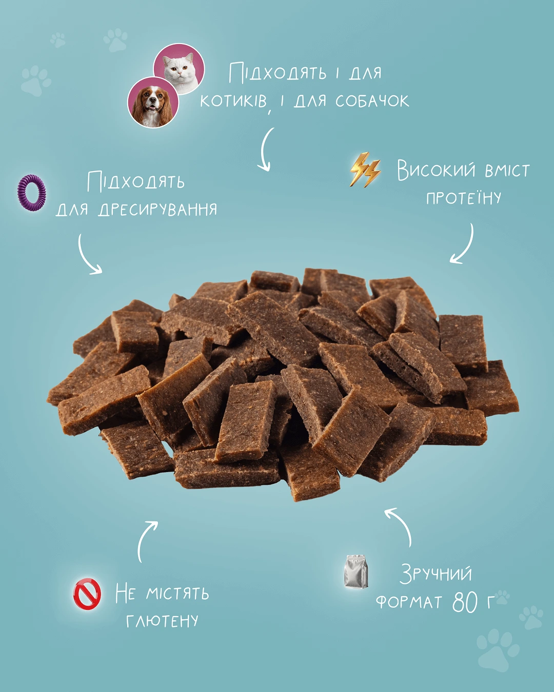 М’яка текстура смаколиків дозволяє легко ділити їх на порції, що робить їх незамінними при дресируванні собак та котів будь-якого розміру та віку.